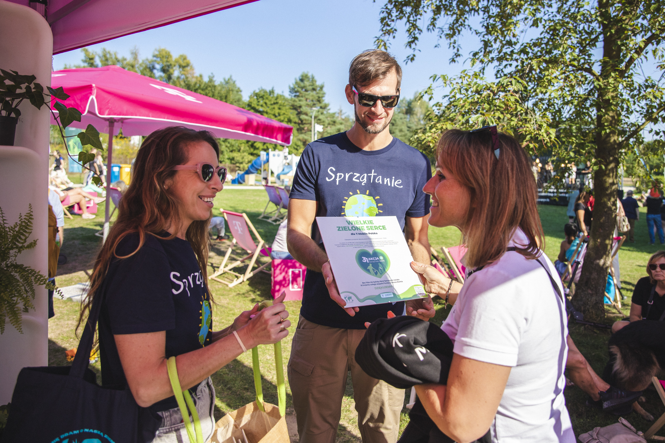 - Podczas wydarzeń terenowych zawsze jest moment na nagrody, gratulacje i podziękowania! Koordynatorka Wydarzeń Finałowych Sandra Rybnicka wraz z Grzegorzem Mikosza wręczają Wielkie Zielone Serce Partnerowi 31. Finału Akcji Sprzątanie świata- Polska, firmie T-Mobile Polska