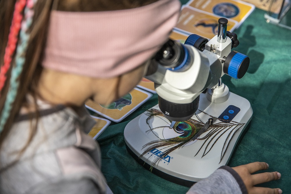 - Pawie pióro pod mikroskopem na stoisku Nowego Zoo Poznańskiego