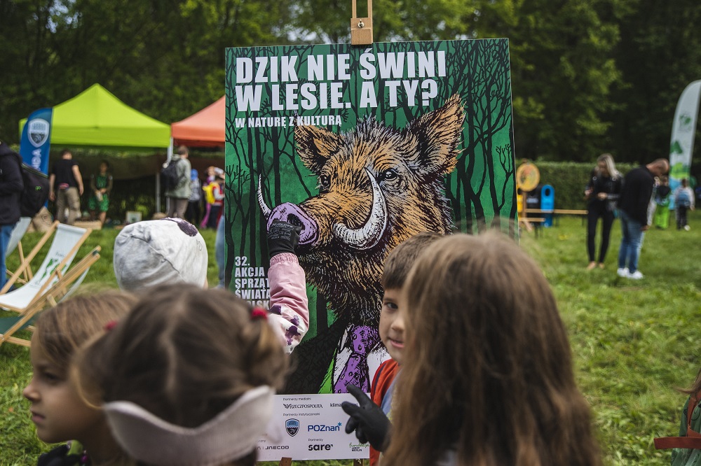 W krzywym zwierciadle plakatu odbija się każdy, kto nie dba o czystą naturę, któremu po prostu brak kultury, by w lesie, na plaży, czy nad wodą zachować się poprawnie. Do obowiązującego w tym roku hasła kampanii „W Naturę z Kulturą” Mistrz dodał wyrazisty slogan „Dzik nie świni w lesie. A Ty?” A my dodaliśmy do prezentacji plakatu magiczny znak, czyli pocieranie fioletowego noska Dzika Eleganta tuż przed wyruszeniem na sprzątanie. Ma to wróżyć mało śmieci w naturze. Czy się sprawdza? Z tym bywa różnie, ale chętnych do pocierania noska Dzika Eleganta nie brakuje!
